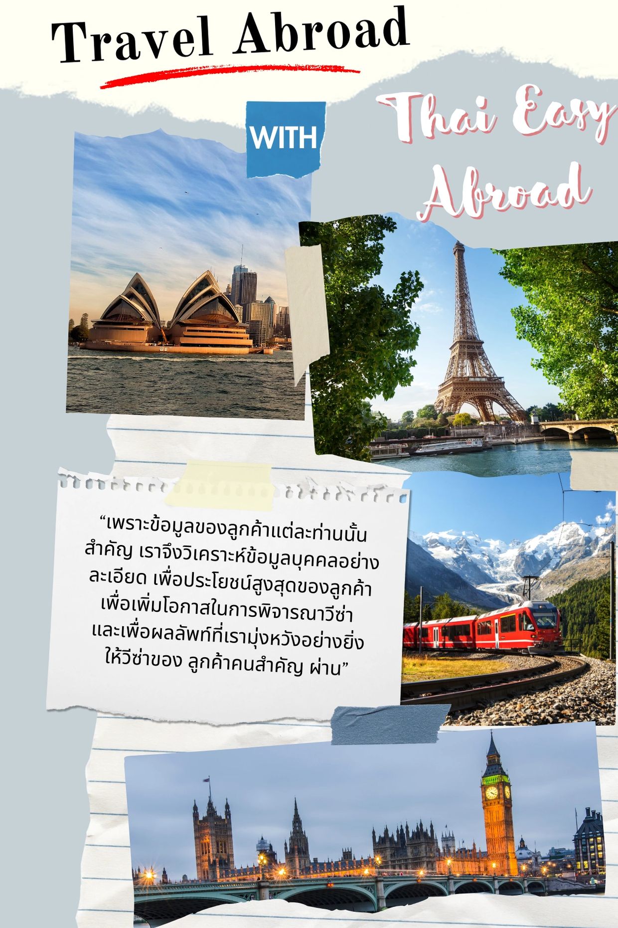 ขอวีซ่า ไปท่องเที่ยว เยี่ยมแฟน ครอบครัว รายการเอกสารที่ใช้ย่อมต่างกัน เจ้าหน้าที่ของเราเชี่ยวชาญ สื่อสารภาษาอังกฤษ สามารถวิเคราะห์โปรไฟล์ ได้แม่นยำ และออกแบบนำเสนอข้อมูลที่ตรงจุดให้กับสถานทูตพิจารณา